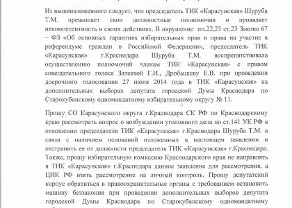 - о превышении должностных полномочий председателем ТИК «Карасунская» Шаруба Т.М.;