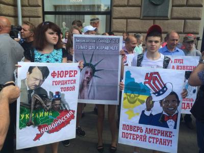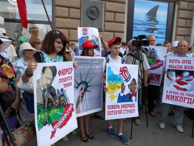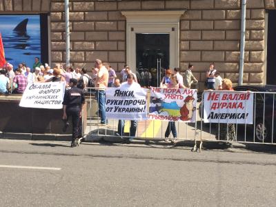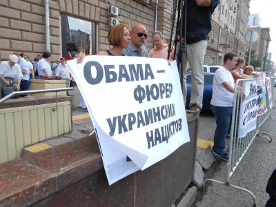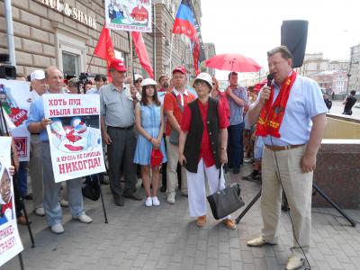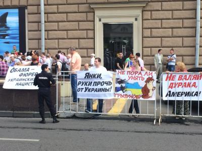 16 июля коммунисты и жители Москвы и Подмосковья собрались возле американского посольства в Москве. Они пришли на встречу с депутатами КПРФ. Собравшиеся выразили свой решительный протест против поддержки властями США режима убийц и карателей Киева.