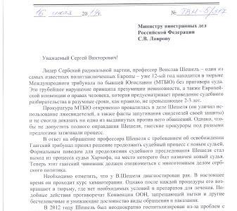 Депутат Государственной Думы, Председатель российского общественного комитета в защиту В. Шешеля Вячеслав Тетёкин направил письмо Министру иностранных дел Сергею Лаврову. В своем письме он в очередной раз привлекает внимание внешнеполитического ведомства к беспрецедентной ситуации в связи с грубыми нарушениями международного права в деле профессора Шешеля. Депутат-коммунист призывает задействовать все имеющиеся инструменты политико-дипломатического характера для освобождения сербских узников, ныне томящихся в гаагской тюрьме.