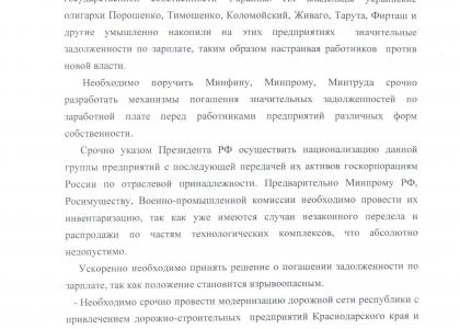 Также необходимо провести комплексную проверку необоснованного повышения цен на целый ряд продуктов и товаров первой необходимости, выработать меры по пресечению необоснованного роста цен.