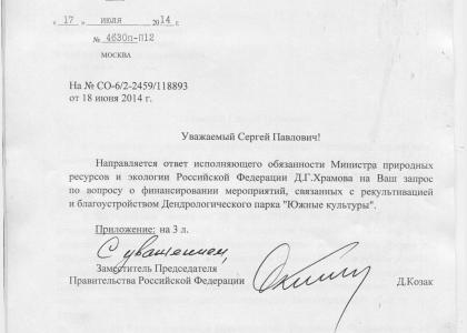 На имя депутата Госдумы фракции КПРФ (от Краснодарского края) С.П. Обухова пришло письмо от заместителя председателя Правительства РФ Д. Козака и исполняющего обязанности министра природных ресурсов и экологии РФ Д.Г. Храмова. Ранее депутат обращался с запросом по вопросу о финансировании мероприятий, связанных с рекультивацией и благоустройством дендрологического парка «Южные культуры».
