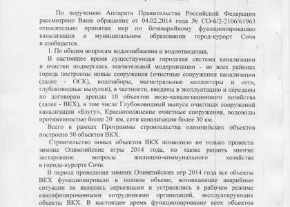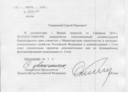 На имя депутата ГД от Краснодарского края (фракция КПРФ) С.П. Обухова пришло письмо от заместителя председателя правительства РФ Д. Козака. Ранее депутат запрашивал информацию о принятых мерах по безаварийному функционированию канализации в г. Сочи.