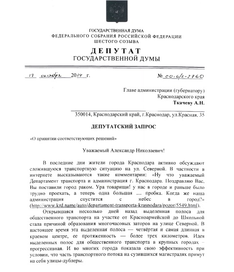 В связи с широким общественным резонансом и многочисленными обращениями граждан, а также на основании статей 7, 14 Федерального закона «О статусе члена Совета Федерации и статусе депутата Государственной Думы Федерального Собрания Российской Федерации», прошу рассмотреть вопрос о целесообразности организации выделенной полосы для общественного транспорта на ул. Северной г. Краснодара, а также вернуться к проработке всех возможных вариантов организации дорожного движения и комплексных мер по оптимизации схем дорожного движения в г. Краснодаре с широким обсуждением их совместно со специалистами в этой области, экспертами политических партий и общественностью.