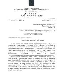 Депутат Государственной Думы С.П.Обухов направил губернатору края А.Н.Ткачеву запрос, в котором потребовал принять меры по исправлению ситуации, возникшую из-за бездумных решений городских чиновников, организовавших дополнительный транспортный кризис в столице Кубани.