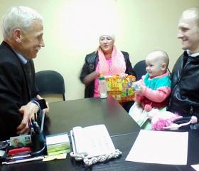Обратилась к депутату и многодетная семья Тищенко, состоящая из пяти человек, в которой воспитываются трое малолетних детей. Проживает эта многочисленная семья в одной комнате размером - 14,9 квадратных метров в четырехкомнатной коммунальной квартире. А в январе 2015 года ожидается рождение еще одного ребенка. Суть обращения - закрепление за многодетной семьей еще одной освободившейся комнаты в этой же квартире. Эту комнату С.В. Тищенко получил еще в 2008 г., будучи сиротой. На тот момент глава семейства не знал, что ему полагается отдельная квартира, поэтому согласился на комнату 14,9 квадратных метров. Когда узнал, что по закону ему полагалось отдельное жилье: было уже поздно, в органах власти пояснили, что статус «сироты» им уже исчерпан. Вот многодетная семья и ютится на 14,9 квадратных метрах. Поэтому освободившаяся вторая комната им очень нужна. Родители пришли на личный прием с младшей дочерью, которая за время приема успела подружиться с Виктором Петровичем.