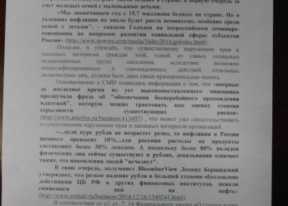 «…если курс рубля не возрастёт резко, то инфляция в России намного превысит 10%...для россиян расходы на продукты составляют более 30% доходов. А поскольку более 80% вкладов физических лиц сейчас существуют в рублях, девальвация означает также, что накопления людей «исчезнут».