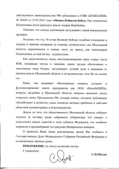 Депутат Госдумы фракции КПРФ С.П. Обухов направил депутатский запрос генеральному прокурору РФ Ю.Я. Чайке в связи со сложившейся ситуацией в Подмосковье после прихода к власти Андрея Воробьева.