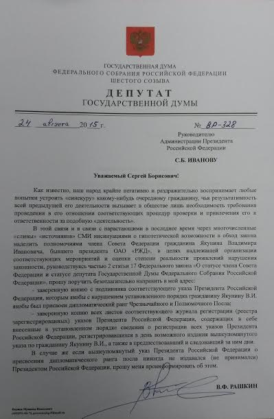 Объясняется это достаточно просто: Якунину прочат место в Совете Федерации от Калининградской области, однако в Калининграде тот никогда не жил и преодолеть ценз осёдлости ему поможет только статус чрезвычайного и полномочного посла. Указ президента о предоставлении такого статуса не является секретным, однако до сих пор никаких следов такого указа обнаружить не удалось. Чтобы выяснить, когда и за какие заслуги Якунин получил дипломатический ранг, а также получить копию президентского указа, зампред ЦК КПРФ, депутат Госдумы Валерий Рашкин направил запрос в администрацию президента России.