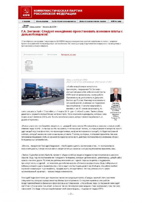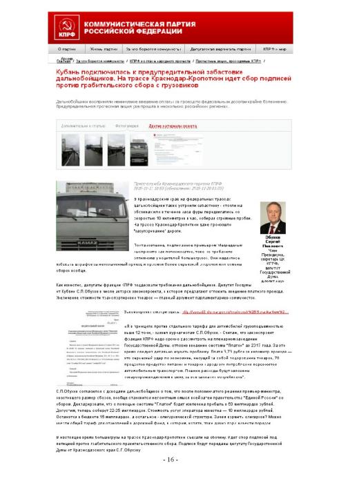 Здесь представлены материалы, отражающие позицию КПРФ в связи с самым крупным общественно-политическим конфликтом последнего месяца - вокруг дополнительного сбора с дальнобойщиков.
