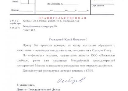 Депутат-коммунист Государственной Думы, член Комитета Госдумы по природным ресурсам, природопользованию и экологии Олег Лебедев направил правительственную телеграмму в Генеральную прокуратуру РФ по вопиющему факту жестокого обращения с краснокнижными дельфинами.