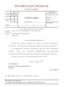 Депутат-коммунист Государственной Думы, член Комитета Госдумы по природным ресурсам, природопользованию и экологии Олег Лебедев направил правительственную телеграмму в Генеральную прокуратуру РФ по вопиющему факту жестокого обращения с краснокнижными дельфинами.