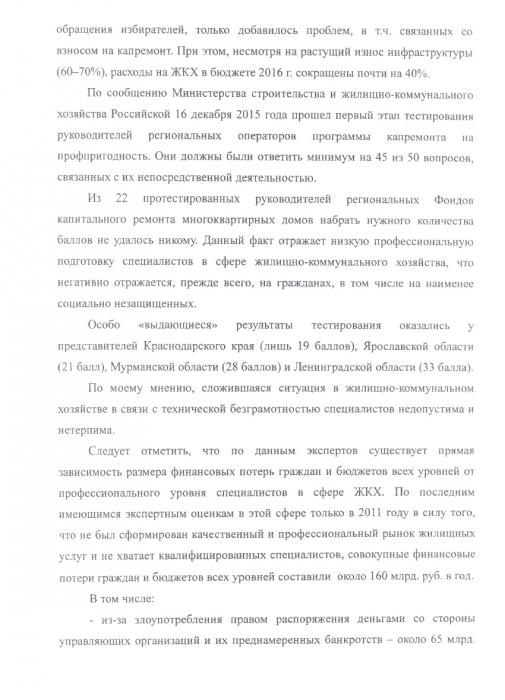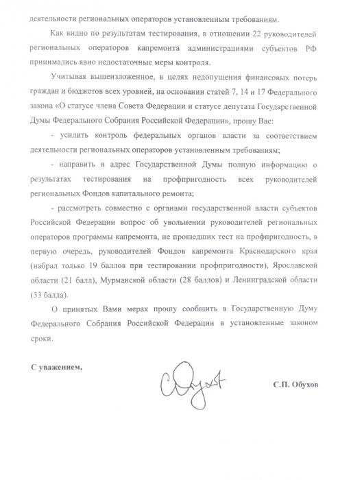 С.П. Обухов пишет, что 16 декабря прошел первый этап тестирования руководителей региональных операторов программы капремонта на профпригодность. Они должны были ответить минимум на 45 из 50 вопросов, связанных с их непосредственной деятельностью. "Из 22 протестированных руководителей региональных фондов капитального ремонта многоквартирных домов набрать нужного количества баллов не удалось никому. Данный факт отражает низкую профессиональную подготовку специалистов в сфере жилищно-коммунального хозяйства, что негативно отражается, прежде всего, на гражданах", - утверждает депутат.