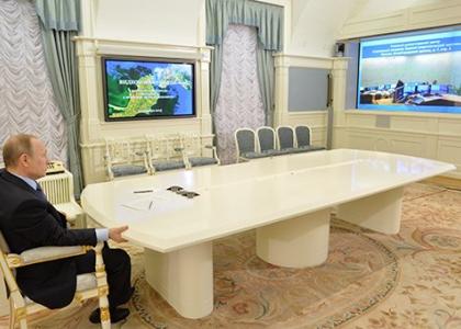 На фото: Президент России Владимир Путин проводит видеоконференцию по случаю открытия второго энергомоста через Керченский пролив в Крым, 15 декабря 2015 года
