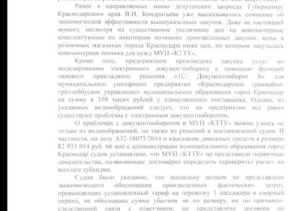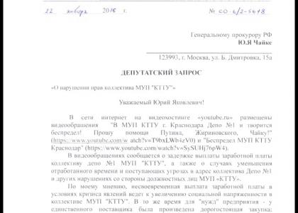 Депутат Госдумы от Краснодарского края С.П. Обухов направил депутатские запросы губернатору края и в генпрокуратуру в связи с нарушениями прав трудового коллектива Краснодарского трамвайно-троллейбусного управления.