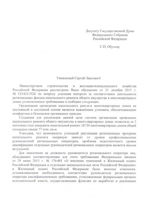 Заместитель Председателя Правительства РФ Д.Козак предоставил депутату Госдумы фракции КПРФ С.П. Обухову информацию по вопросу усиления контроля за соответствием деятельности региональных фондов капитального ремонта общего имущества в многоквартирных домах установленным требованиям.