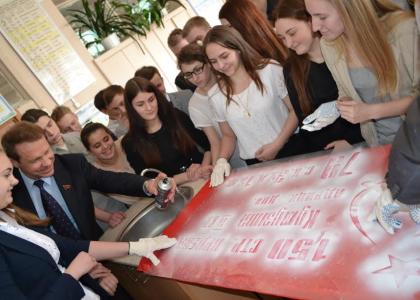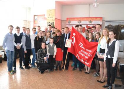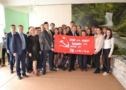 сфотографировались около изготовленной своими руками копии Знамени Победы, а
