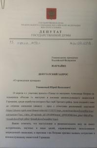 Депутаты Госдумы от КПРФ В.Ф. Рашкин и С.П. Обухов обратились к генпрокурору России Ю.Я. Чайке с просьбой провести проверку после выступления участника проекта «Танцы со звездами» Александра Петрова на телеканале «Россия 1», который выступил в костюме военнослужащего нацистской Германии.