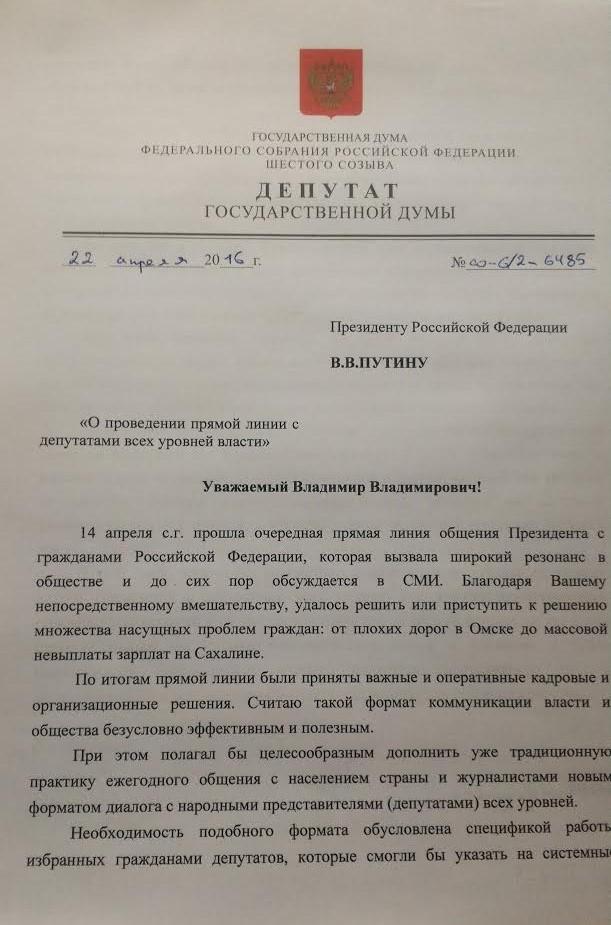 Депутат Госдумы от КПРФ Сергей Обухов обратился к президенту России Владимиру Путину с просьбой ежегодно проводить "прямую линию" с парламентариями всех уровней и представителями министерств и ведомств.