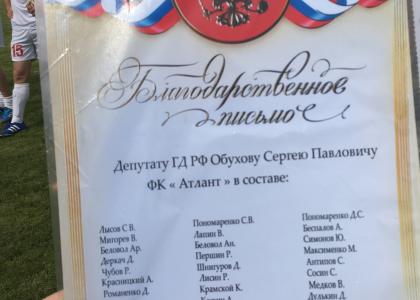 По окончании спортивного мероприятия депутат ГД РФ вручил игрокам обеих команд кубки и лучшие игроки в различных номинация "Лучший вратарь", "Лучший защитник", "Лучший полузащитник", "Лучший нападающий" и "Самый ценный игрок" получили призы из рук депутата. Также команде "Атлант" были подарены 2 футбольных мяча для тренировок.