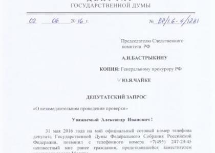 Депутат направил запрос председателю Следственного комитета Александру Бастрыкину и генеральному прокурору Юрию Чайке и попросил разобраться в этом инциденте.