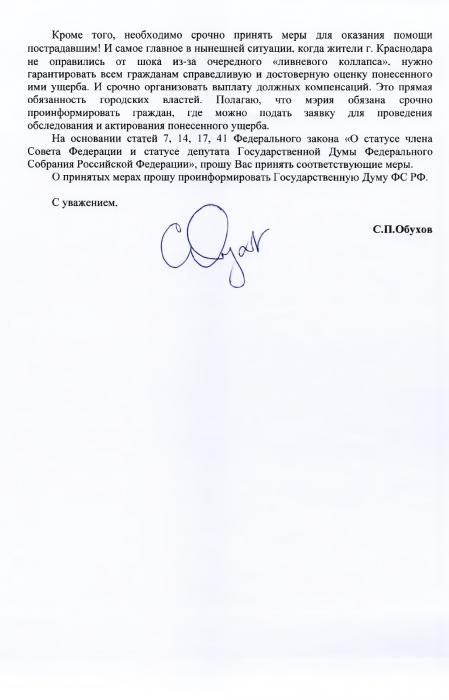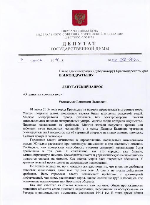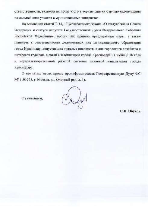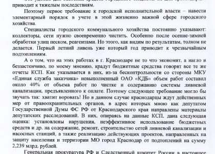 Краснодарский край. Депутат Госдумы от Краснодарского края (фракция КПРФ) С.П. Обухов потребовал от губернатора В.И. Кондратьева привлечь к ответственности городских чиновников, виновных в очередном затоплении Краснодара.