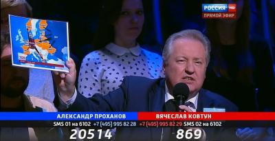 В эфире канала "Россия-1" 9 июнясостоялась полемическая битва украинских патриотов и их российских союзников с экспертно-журналистской обслугой преступного киевского режима. Команда писателя Александра Проханова и секретаря ЦК КПРФ Сергея Обухова, куда вошли журналисты с Украины, победила "яблочно-бандеровскую" команду киевского политолога Вячеслава Ковтуна с более чем двадцатикратным преимуществом.