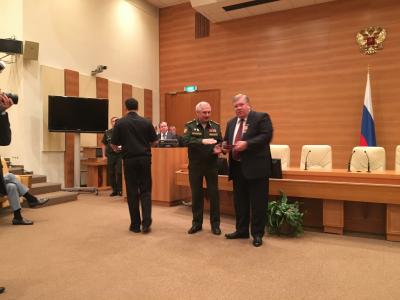 Судя по фотографиям парламентариев, в числе тех, кто получил медаль оказались лидер ЛДПР Владимир Жириновский, Председатель ЦК КПРФ Геннадий Зюганов, секретарь ЦК КПРФ Сергей Обухов, зампреды ЦК КПРФ Дмитрий Новиков, Владимир Кашин, секретари ЦК КПРФ Юрий Афонин и Казбек Тайсаев, депутаты фракции КПРФ Александр Ющенко и Сергей Гаврилов, "единороссы" Иосиф Кобзон, Валентина Терешкова, Александр Карелин, Ирина Роднина, Зелимхан Муцоев, Алексей Пушков, Александр Ильтяков, лидер "Родины" Алексей Журавлев и некоторые другие – всего более 30 парламентариев. Вручал награды начальник Главного управления кадров Минобороны РФ генерал-полковник Виктор Горемыкин.