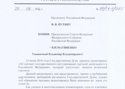 Коммунист призвал Путина и Матвиенко принять все меры для того, чтобы законопроект прошёл полную и всеобъемлющую проверку.