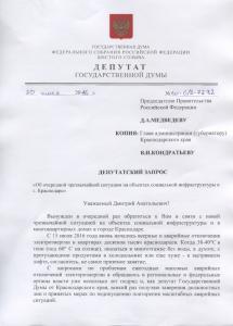 Депутат Госдумы от Краснодарского края (фракция КПРФ) С.П. Обухов направил депутатский запрос Председателю Правительства РФ Д.А. Медведеву. Копия запроса направлена главе администрации (губернатору) Краснодарского края В.И. Кондратьеву.