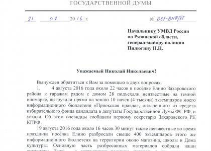 Первый секретарь Рязанского обкома КПРФ, депутат Госдумы В.Н. Федоткин обратился к начальнику УМВД России по Рязанской области в связи с многочислеными фактами провокаций в ходе предвыборной кампании.
