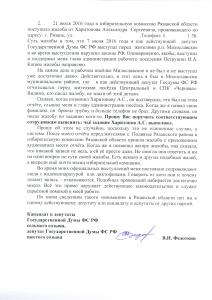 2.21 июля 2016 года в избирательную комиссию Рязанской области поступила жалоба от Харитонова Александра Сергеевича, проживающего по адресу: г. Рязань, ул. Новаторов, д. 19, кор.3, кв.28.Телефон: 8 910 564 01 38. Суть жалобы в том, что 7 июля 2016 года я как действующий депутат Государственной Думы ФС РФ выступал перед жителями р.п. Милославское и во время выступления нарушил законы РФ. Одновременно, якобы, выступил и поддержал меня глава администрации рабочего поселения Петрушин И.А. Копию жалобы направляю.