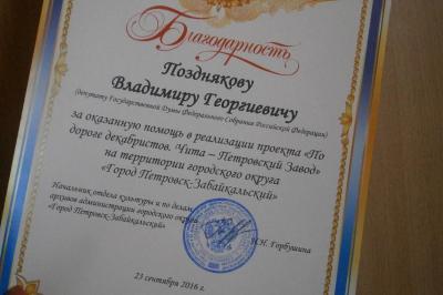 При поддержке депутата Государственной Думы В.Г. Позднякова в с. Харауз и в г. Петровске-Забайкальском, где 186 лет назад завершился пеший переход декабристов из Читинского острога во вновь отстроенную тюрьму при Петровском железоделательном заводе, установлены памятные знаки в виде «верстовых столбов». 23 сентября памятники представлены местным жителям.