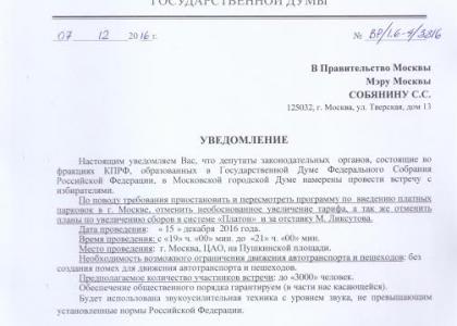 В мэрию Москвы направлено уведомление о том, что 15-го декабря на Пушкинской площади состоится встреча депутатов фракций КПРФ в Госдуме и Мосгордуме с избирателями. Ранее правительство столицы отказалось согласовать митинг на этом же месте, мотивируя это тем, что на площади ведётся установка украшений к новому году и Рождеству.