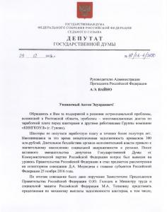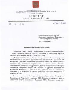В письмах к руководителю администрации президента Антону Вайно и полномочному представителю президента в Южном федеральном округе Владимиру Устинову депутат отметил, что длительное бездействие органов власти привело к накоплению социальной напряжённости в регионе. Общий долг перед горняками составляет 350 млн рублей