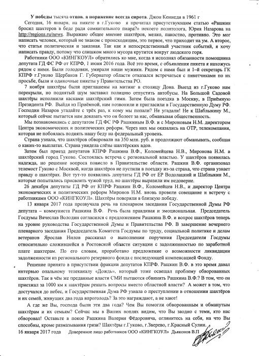 А где же Вы, господа были эти два года? Чем Вы помогли обворованным и обманутым шахтёрам и их семьям? Сейчас мы в Ваших воплях видим, что Вы заодно с теми, кто нас обворовал! Оставьте в покое Рашкина Валерия Фёдоровича, оглянитесь на себя, на что Вы способны, кроме размазывания грязи?»