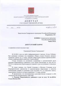 Заместитель Председателя ЦК КПРФ, депутат Госумы В.Ф. Рашкин направил запросы заместителю Генерального прокурора Российской Федерации Л.Г. Коржинеку и Генеральному прокурору Российской Федерации Ю.Я. Чайке в связи сомнительными судебными решениями и бездействием мэрии Краснодара по отчуждению муниципальной земли.