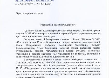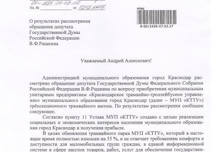 Депутату Госдумы В.Ф. Рашкину пришел ответ на его запрос от заместителя главы муниципального образования город Краснодар Е.В. Зименко.