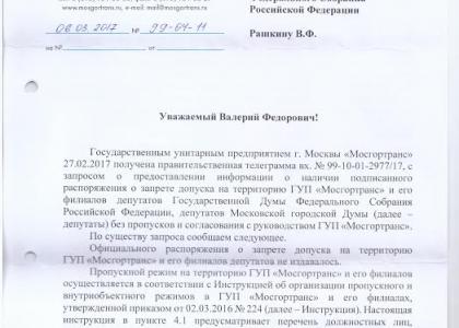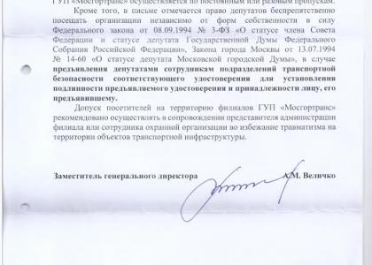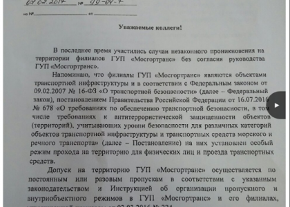 В начале февраля к московским коммунистам попал якобы документ ГУП «Мосгортранс», адресованный директорам филиалов. В нём заместитель генерального директора предприятия Алексей Величко напоминает коллегам, что вход на территорию «Мосгортранса» осуществляется только по пропускам. В документе особо отмечается, что депутаты Московской городской думы также не имеют права беспрепятственно проходить на предприятие.