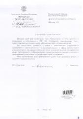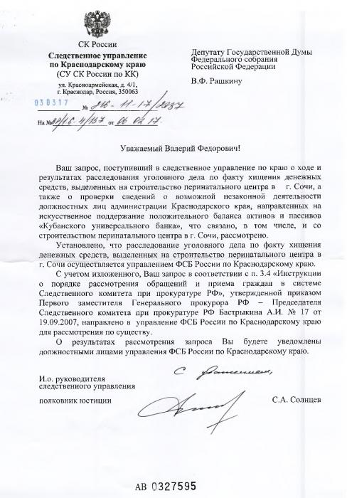 «Ваш запрос, поступивший в следственное управление по краю о ходе и результатах расследования уголовного дела по факту хищения денежных средств, выделенных на строительство перинатального центра в г. Сочи, а также о проверки сведений о возможной незаконной деятельности должностных лиц администрации Краснодарского края, направленных на искусственное поддержание положительного баланса активов и пассивов «Кубанского универсального банка», что связано, в том числе, и со строительством перинатального центра в г. Сочи, рассмотрено.