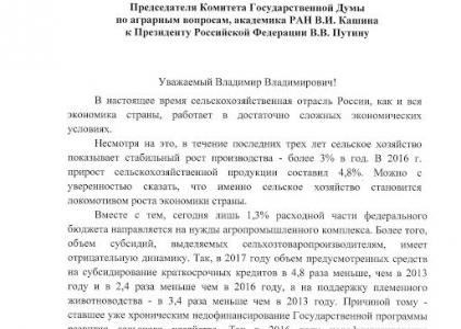 Публикуем Открытое письмо Председателя Комитета Государственной Думы по аграрным вопросам, академика РАН В.И. Кашина к Президенту Российской Федерации В.В. Путину.