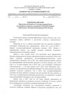 Публикуем Открытое письмо Председателя Комитета Государственной Думы по аграрным вопросам, академика РАН В.И. Кашина к Президенту Российской Федерации В.В. Путину.