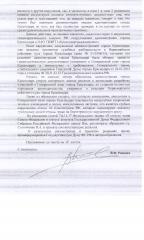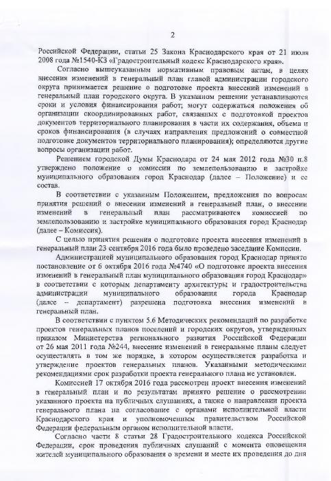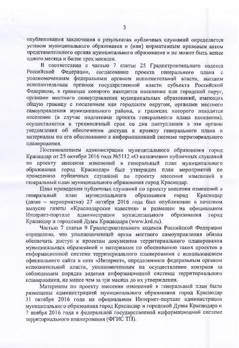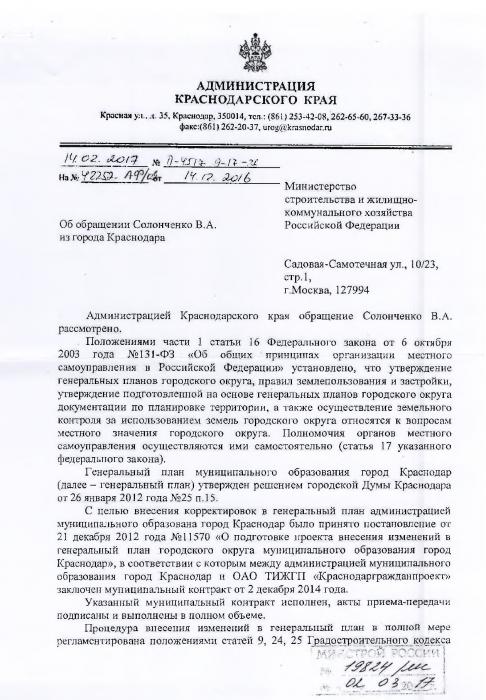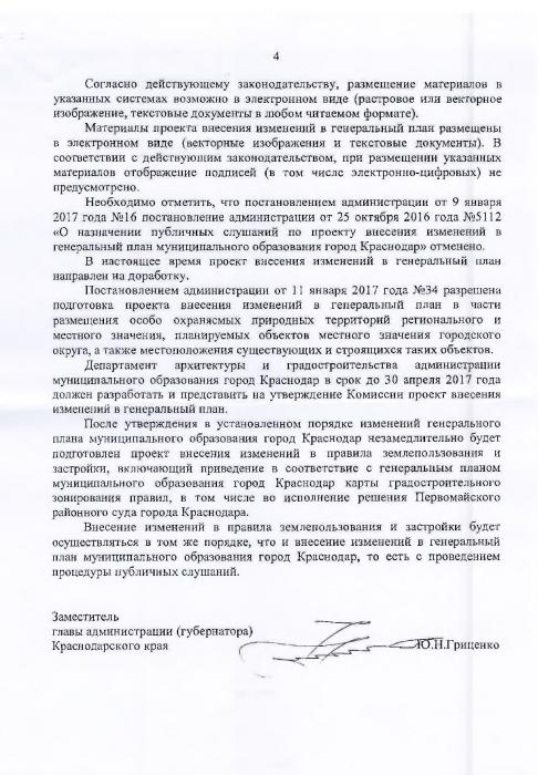 По требованию В.Ф. Рашкина администрация города Краснодара рассмотрела обращение В.А. Солонченко и приняла решение отправить спорный документ на доработку. «В настоящее время проект внесения изменений в генеральный план направлен на доработку, - пишет Ю.Н. Гриценко. – Департамент архитектуры и градостроительства администрации муниципального образования город Краснодар в срок до 30 апреля 2017 года должен разработать и представить на утверждение Комиссии проект внесения изменений в генеральный план». Дополнительно Ю.Н. Гриценко сообщил, что будет обязательно учтено решение Первомайского районного суда города Краснодара, а также будут проведены соответствующие публичные слушания.