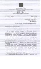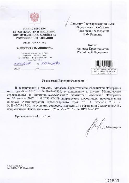 Депутаты Госдумы В.Ф. Рашкину пришли ответы на его запросы от заместителя Министра Министерства строительства и жилищно-коммунального хозяйства РФ Х.Д. Мавлиярова, директора департамента стратегического и территориального планирования Минэкономразвития России Е.С. Чугуевской и заместителя главы администрации (губернатора) Краснодарского края Ю.Н. Гриценко.