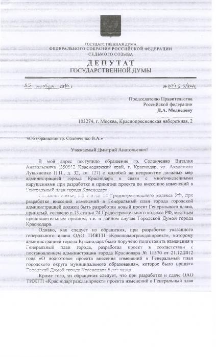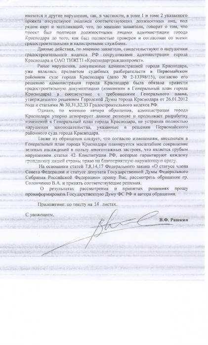 Ранее к депутату В.Ф. Рашкину обратился житель Краснодарского края В. А. Солонченко и депутат ГД 6-го созыва С.П. Обухов. Они обратили внимание депутата на многочисленные нарушения при разработке и принятии проекта по внесению изменений в Генеральный план города Краснодара. В частности, по новому генплану планируется масштабное сокращение зеленых насаждений в пользу многоэтажных застроек. При этом администрация города, по мнению заявителя, игнорировала соответствующее решение Первомайского районного суда города Краснодара, по которому необходимо было устранить имеющиеся недостатки в документе (этот документ готовил ОАО ТИЖГП «Краснодаргражданпроект» по поручению администрации города Краснодара).