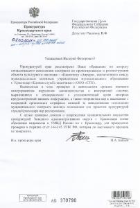 «Выявленные в ходе проверки в деятельности органов местного самоуправления нарушения законодательства о контрактной системе, выразившиеся в ненаправлении в уполномоченный орган контроля предусмотренной законом информации, а также непринятии мер к взысканию с подрядной организации штрафных санкций за ненадлежашее исполнение муниципального контракта явились основанием для принятия прокуратурой города Краснодара мер реагирования», - говорится в письме И.А. Бабаева.