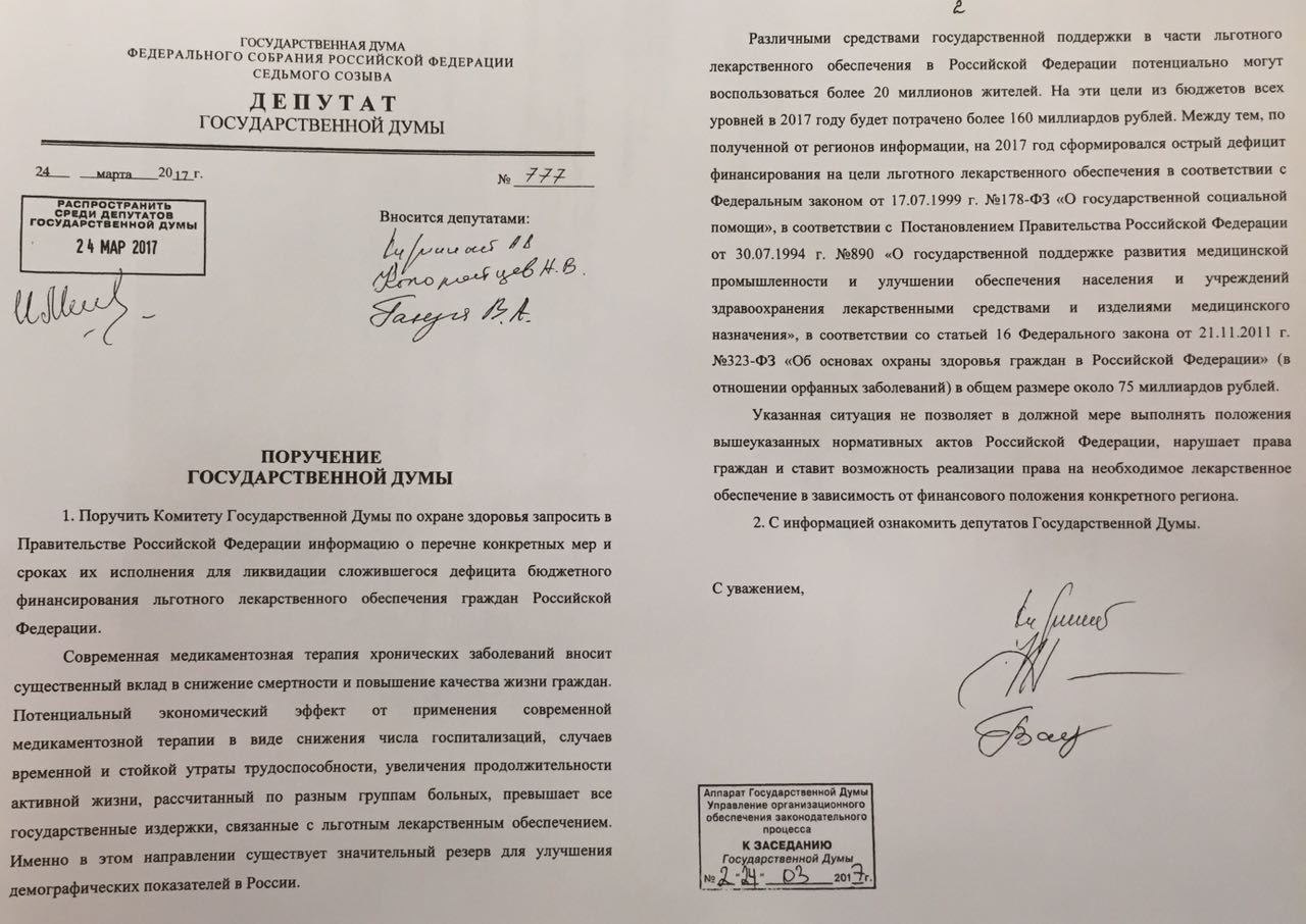 Различными средствами государственной поддержки в части льготного лекарственного обеспечения в Российской Федерации потенциально могут воспользоваться более 20 миллионов жителей. На эти цели из бюджетов всех уровней в 2017 году будет потрачено более 160 миллиардов рублей. Между тем, по полученной от регионов информации, на 2017 год сформировался острый дефицит финансирования на цели льготного лекарственного обеспечения в соответствии с Федеральным законом от 17.07.1999 г. №178-ФЗ «О государственной социальной помощи», в соответствии сПостановлением Правительства Российской Федерации от 30.07.1994 г. №890 «О государственной поддержке развития медицинской промышленности и улучшении обеспечения населения и учреждений здравоохранения лекарственными средствами и изделиями медицинского назначения», в соответствии со статьей 16 Федерального закона от 21.11.2011 г. №323-ФЗ «Об основах охраны здоровья граждан в Российской Федерации» (в отношении орфанных заболеваний) в общем размере около 75 миллиардов рублей.