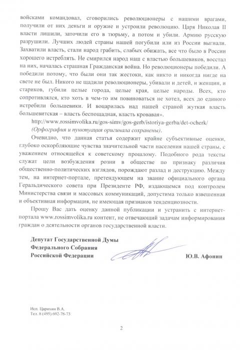 Член Президиум, секретарь ЦК КПРФ, депутат Госдумы Ю. В. Афонин направил депутатские запросы в связи с размещением на интернет-портале «Российская символика» фантастических по грубости антисоветских выпадов. При этом речь идет о текстах, которые адресованы детям и могут быть использованы на уроках в школе!