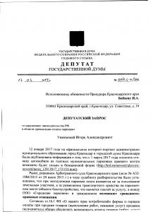 Госдумы 7-го созыва В.Ф. Рашкина пришел ответ от прокурора Краснодарского края