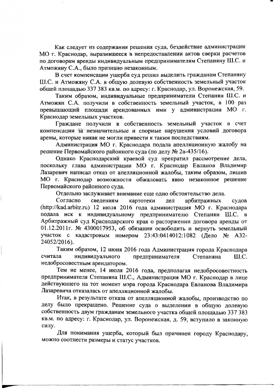 Суть вопроса. Частные лица Сергей Атможян и Шагокат Степанян из-за бюрократических проволочек в администрации Краснодара в качестве компенсации ущерба по решению суда получили 33,7 га городских земель, кадастровая стоимость которых превышает 1,3 млрд рублей. В.Ф. Рашкин и С.П. Обухов предположили, что здесь дело нечисто, поэтому подготовили соответствующий запрос.