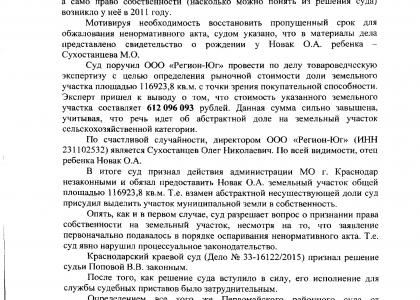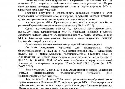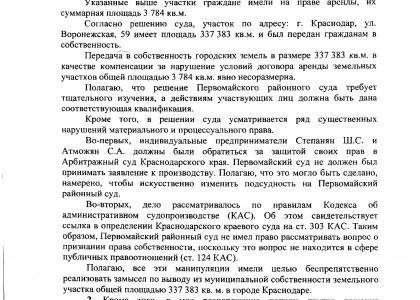 «В силу установленных законом ограничений прокурор не вправе принимать участие в его рассмотрении», «Администрация Краснодара проинформирована прокуратурой города о необходимости защиты прав муниципального образования вплоть до высших судебных инстанций», «Дело направлено на новое рассмотрение в Советский районный суд г. Краснодара», - говорится в ответе И.А. Бабаева.
